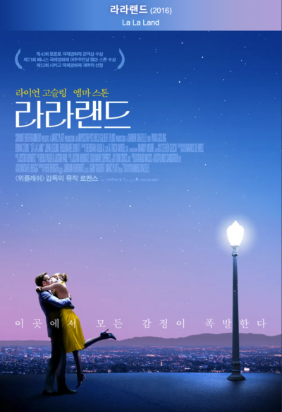 "라라랜드"는 2016년에 개봉한 Damien Chazelle 감독의 뮤지컬 드라마 영화입니다. 라이언 고슬링과 엠마 스톤이 주연을 맡아 멋진 연기와 노래로 시청자들을 매료시킨 작품입니다. 아름다운 음악과 댄스, 화려한 무대와 풍부한 색감, 그리고 훈훈한 감동적인 이야기가 조화로운 작품입니다.