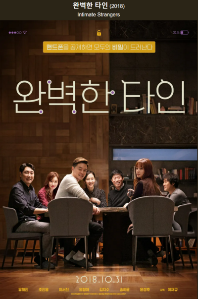 '완벽한 타인' 은 2018년에 제작된 한국 영화입니다. 서로 핸드폰의 내용을 공유하는 일종의 진실게임을 통하여 가장 가까운 지인이 완벽하게 타인이 될 수 있다는 고찰을 하게 해주 블랙코미디입니다. 등장인물은 조진웅, 김지수, 유해진, 염정아, 이서진, 송하윤, 윤경호 등이 있습니다. 이 영화는 여타 영화들과는 다르게 주연배우랄 게 없는 구성으로 이야기가 진행된다는 점이 특이합니다. 원작은 2016년에 개봉한 "퍼펙트 스트레인저(Perfetti sconosciuti)"이며, 이 영화는 개봉한지 얼마 안 되어 한국 등 여러 나라에 가장 많이 리메이크 된 영화로 기네스북에 등재되었다고 합니다.